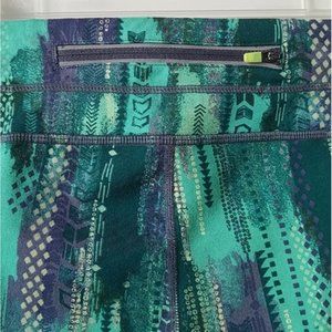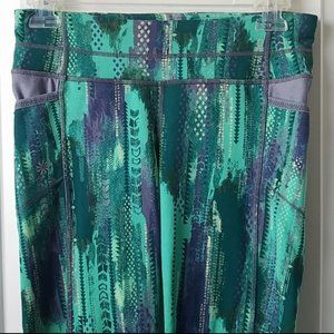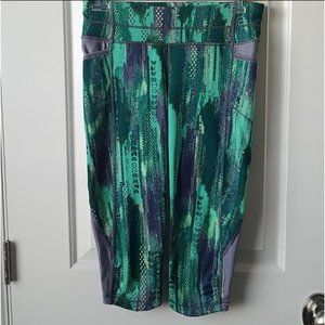 Athleta capri work out leggings. Abstract green, grey and yellow print. Four pockets - 1 rear zip pocket, 1 internal key pocket and 2 hip pockets. Adjustable continuous loop drawstring. Breathable Coolmax crotch gusset and mesh ventilation behind knees to keep you cool.