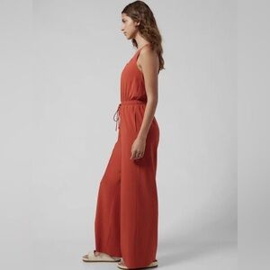 Dress up or dress down this stunning Athleta Savannah Jumpsuit in rust orange/currant red. The V-neckline and ruffle straps add a feminine touch while the elastic tie waist and wide-leg design provide comfort and versatility. Perfect for travel, activewear, or casual occasions, this one-piece jumpsuit features pockets and is machine washable for easy care. Made of a blended fabric with polyester and spandex, it comes in a regular fit and size type. Ideal for any season, this jumpsuit is a must-have for any fashion-forward woman.