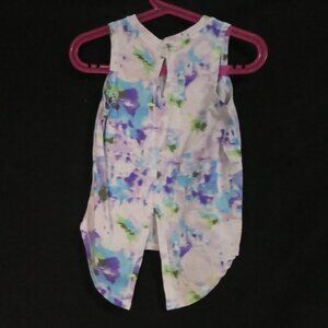 A vibrant sleeveless top with a mix of colorful abstract patterns in blue, green, and purple on a white base