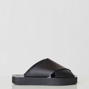 Acai platform slides in black vegetable-tanned calf leather. Handmade in Italy with crossed leather straps. Cushioned leather soles give extra support. Leather lining.