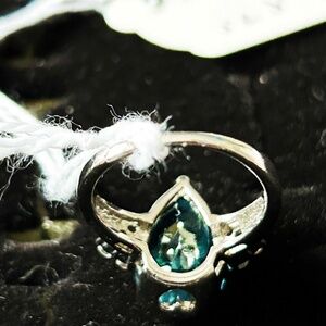 AUSTRIAN CHRYSTAL RING, STERLING SILVER, SIZE 8, BLUE PEAR CUT BEZEL SET, GENUINE FACETED CHRYSTAL, 6 SIDESTONES PRONG SET, NEW, TAG ON
