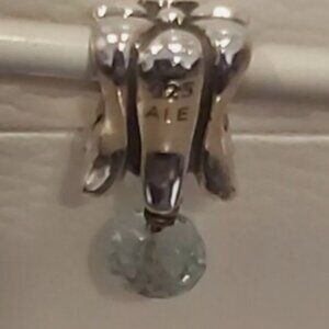 This rare and sought after Pandora charm featured a sterling silver bead shaped like a tulip has an additional aquamarine dangle at its base. The duality makes this charm work equally well against similarly colored glass beads, or charms with a floral theme. The aquamarine stone also commemorates those born in March.