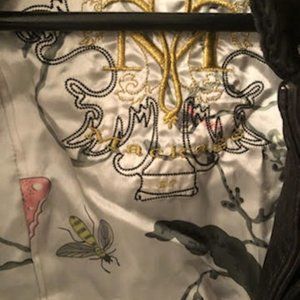 SOFT SMOOTH LAMBSKIN LEATHER. LEATHER BUTTON UP FRONT WITH LEATHER BUCKLE COLLAR CLOSURE. FLORAL BUTTERFLY PRINT INTERIOR LINING.