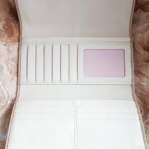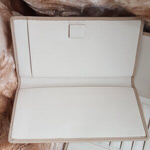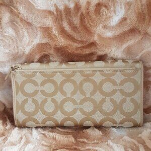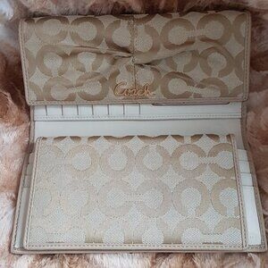 Here's another incredibly rare Coach find. It's the Parker Op Art Checkbook Wallet, style 42461, in rich sand Op Art signature jacquard, trimmed in sand leather, accented by rose tone hardware. This is a two-piece wallet and you're receiving both the full size wallet and removable checkbook case. This wallet is in excellent preowned condition. Looks like it was carried very minimally. It has the sturdy feel of a new wallet. The exterior and interior fabric is perfect, hardware is perfect, and with the exception of a few inconspicuous marks on the leather trim on the front flap and a few minute marks under the flap (see last two photos), the rest is the same. The checkbook cover looks like it was never used. Retailed for $248 US.