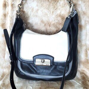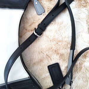 Here's a fabulous, versatile Coach Kristin - the Leather Spectator Hobo, style 22509, in the stunning Black Multi color combination, sporting black, white and grey leather, accented by silver tone hardware. This beauty comes complete with its original detachable, adjustable crossbody strap and Coach leather hang tag. Hard to tell if this bag was ever carried - 99.99% of the bag is in perfect condition. Just the faintest mark on the front which I have tried to show in the close up photo. I suspect this was acquired in storage as the bag truly looks unused, but without that confirmation, I can only describe it as "mint" vs. "New Without Tags". Retailed for $298 US.