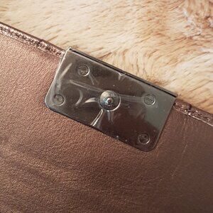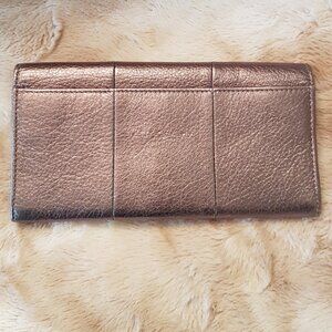 This is a fantastic New Without Tags (never carried) Coach Kristin Leather Slim Envelope Wallet, style 45132, in pewter metallic leather (with the slightest touch of pink tint) accented by pewter hardware. It comes with the Coach care card, and the plastic protective film is still attached to the back of the clasp. Retailed for $218 US.