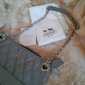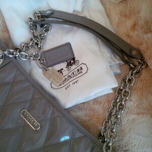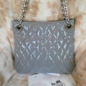 This is a New Without Tags Coach Poppy Liquid Gloss Slim Tote, style 18673, in rich grey patent leather with amazing quilt stitching detail, accented by shiny silvertone hardware. This is called a tote, but also can be worn as a shoulder bag, with the easy-to-convert chain detail strap (check out the photos of each strap options). Comes complete with its two original hangtags and the Coach Liquid Gloss care card, and delivered to you in its Coach satin dustbag. Retailed for $298 US.