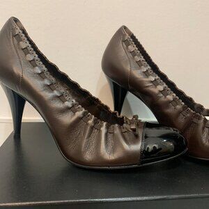 Chocolate brown leather with a scalloped perforated edge Chanel pump.
