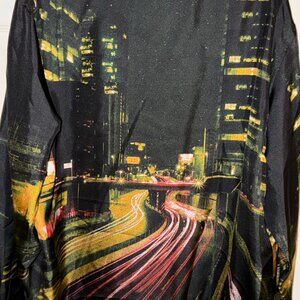 BLACK IN COLOR WITH CITY NIGHT LIGHTS PATTERN AND VERSACE LOGO ON FRONT