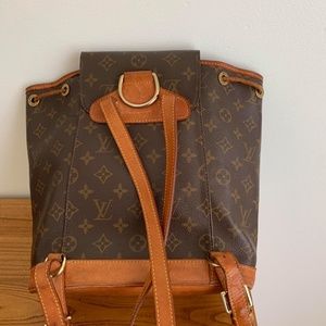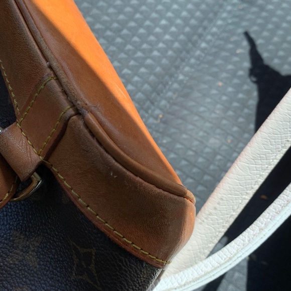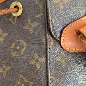 Is in good condition and has minor repairs: a rip situated on the back of the bag and leather replacement.