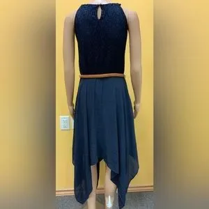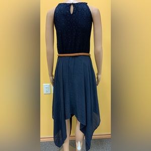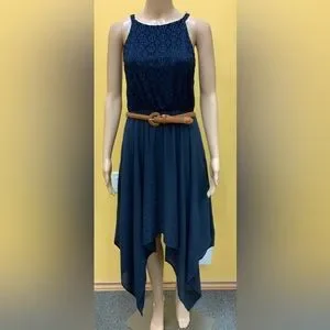 Navy Western Style Dress with Brown Cord Belt. Lace Bodice. Asymmetrical hem. Single Button Closure at back of neck. Lined. Elastic Waist