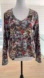 Aventures des Toiles V Neck long sleeve top. The print on the top looks like a painting of people from an overhead perspective. Multicolour including black, green, blue, red, white. The fabric is heavier and very soft. 90% polyester/10% elastane. Made in Tunisia.