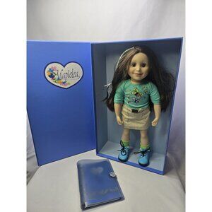 This listing features a 2017-2019 Avonlea Traditions Maplelea Canadian Girl Taryn doll, comes with all included accessories. The box shows some exterior and interior wear and staining. The journal exhibits minor wear and small tears along one insert edge. The doll's boots display some discoloration on the trim, the socks have minor snags, and the doll has a small discoloration spot on its lower lip. Please refer to the accompanying photographs for a comprehensive assessment.