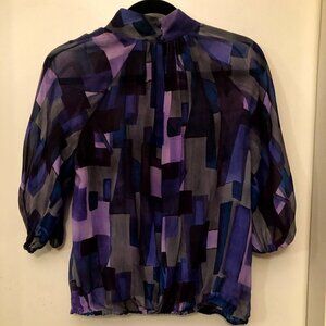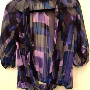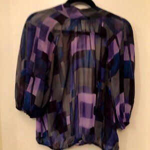 A|X Armani Exchange Silk Open Back Purple Gray Sheer Blouse - Lightweight and thin. Gently preowned. Open back. Puffy sleeves with elastic cuffs. Semi-sheer. No flaws