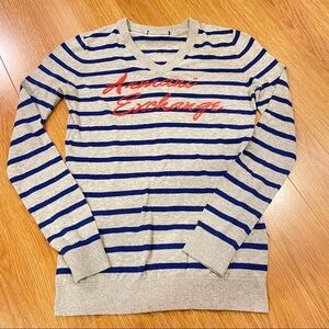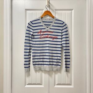 Stay effortlessly stylish with this Armani Exchange striped V-neck sweater, featuring soft 100% cotton fabric in a grey and royal blue stripe pattern. The bold red Armani Exchange logo adds a sporty touch, making it perfect for casual layering.