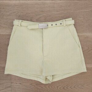 Women's Armani Exchange size 2 gingham shorts. Pale green and cream gingham. Belt (can be removed). Front welt pockets, back pocket with button. 52% rayon, 45% polyester, 2% other fibre. These are high-rise short shorts: 1"5/8 inseam, rise 11.5 inches.