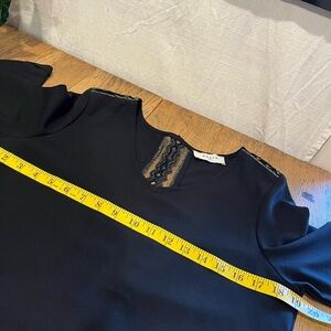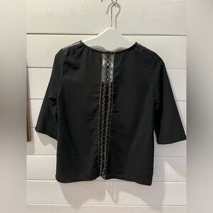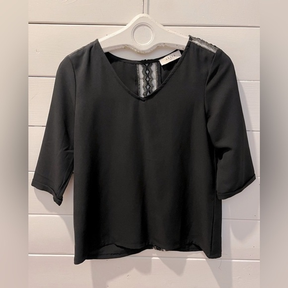 AXARA Paris black blouse with 3/4 sleeves, featuring a delicate lace opening adorned with a gold thread on the back and shoulders. Size M