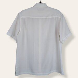 This short sleeve shirt by AXIST (A[X]IST?) is made of a rayon/polyester blend (65/35) and is white with short sleeves. The shirt has a collar and a buttoned front with thin black and brown vertical stripes on either side. The shirt is labelled "Silk Touch" and, though it isn't made of silk, it's got a great feel to it. There is normal wear, but no issues affecting wearability.