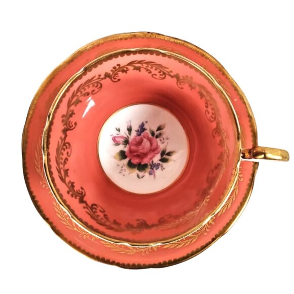 Brighten up your tea time with this stunning vintage Aynsley teacup and saucer set in a gorgeous orange-peach hue. The rich glaze is beautifully accented with gold leaf detailing and a delicate pink rose inside the cup โ a perfect mix of elegance and charm.