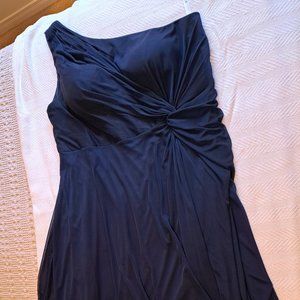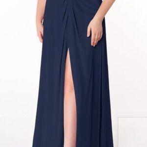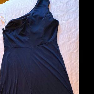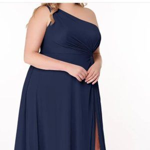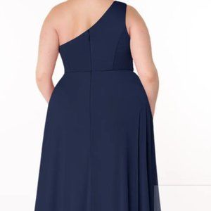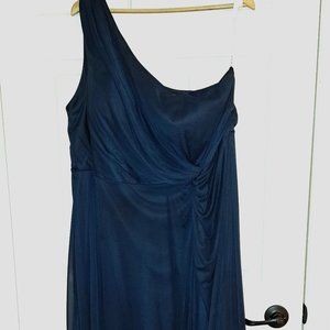 AZAZIE BROOKE Dark Navy A-Line One Shoulder Mesh Floor-Length Dress. Fully lined. Very flattering style with self-bra, and an attractive twist at the waist. The skirt portion has plenty of material so the front slit can be as discreet or revealing as you choose. Dress has been professionally altered (taken in by about 1" on each side at the waist, and bottom hem was shortened by about 2"). Dress measures 62" from top of shoulder strap to hem, and about 45" in circumference at the horizontal waist seam. I'd say it fits like a big 22 or smallish 24. The mesh material is stretchy and comfortable. Was worn for a few hours only by a person of 5'6" in low heels. Dress is in like new condition. Great for late summer/autumn functions, or add a lace shawl or short jacket/bolero and it would make a lovely winter wedding guest or bridesmaid dress, or be great for a holiday party. Pictures taken by me to show that there are no marks, snags or tears, and to show waist twist, hem & slit in detail, but they do not show the true beautiful blue colour as well as the pictures from the Azazie website. The dress looks beautiful on, but not so attractive on a hanger or laid out on a flat surface. This link will take you to the dress, then choose Dark Navy and scroll down to the plus-sized model pictures. Description of fabric etc is here as well. https://www.azazie.ca/products/azazie-brooke-bridesmaid-dress Comes with Azazie garment bag.