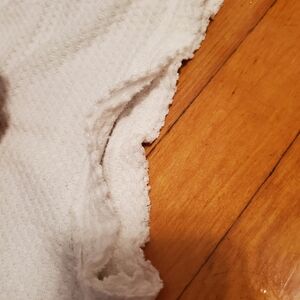 Aakaa oversized hooded sleeveless tunic sweater. White, see through. Women size S. Slight signs of wear on the metal part of the cords (see pictures). Slightly opened at the bottom on both sides as seen on pictures. Soft and stretchy fabric. No stain, no holes. Non smoking house.