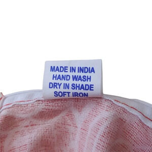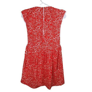 Beautiful vibrant red and white floral dress with capped sleeves and ties at waist. White edging decor with with buttons. Zip at the back. 3/4 length lining.