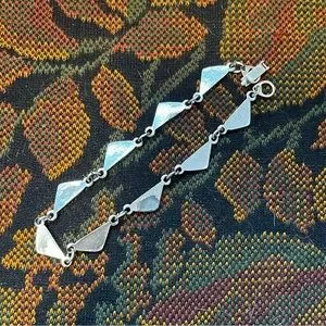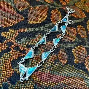 Gorgeous abalone shell bracelet. Unique triangle style, perfect for summer! Some wear on the back that’s hidden when it’s worn, otherwise in great preowned condition, see photos.