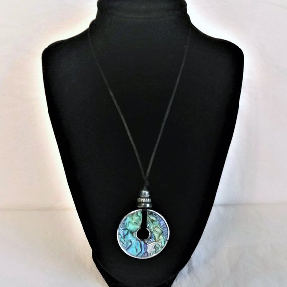 Very Nice Abalone Shell Dolphin Bracelet and Dolphin Pendant Necklace. Multicolored Shells On Silver Tone/Plated Metal. Rope has 3 Beads At Bottom & Has Some Light Fraying. Rope Bunches A Bit When Not Hanging. Pendant Has Some Ware On The Back. It Is app. 18.5" with Pendant. Pendant Is app. 1.5". Bracelet Is app. 7.5" Open, Dolphin Charms Are app. .5". Condition Is Used