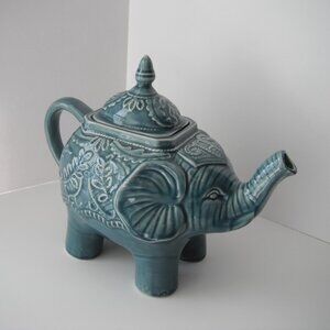 Abbott Collections Elephant Tea Pot Ceramic Trunks Up Green/Blue 7in