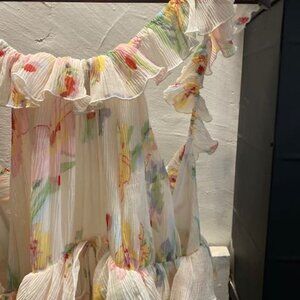 The Abby multicolour maxi dress evokes rippling waters with its crinkle chiffon texture and watercolour floral print. This long summer dress has a distinctive ruffle at the neckline and waist, and a low open back—making it an alluring wedding guest dress option.
