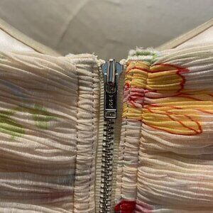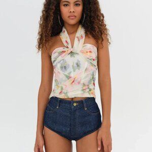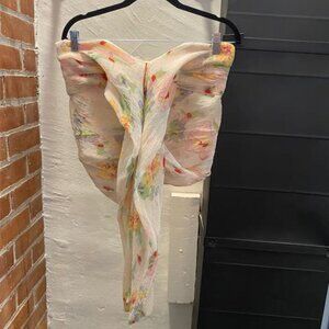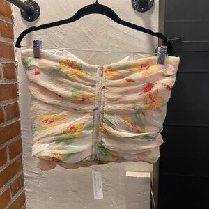 Evoking the soft waves of summer tides, the Abby multicolour strapless top is crafted in a pleated crinkle chiffon featuring a watercolour floral print for an allover ripple effect. The perfect summer top, it features an internal corset with boning, allover ruching, and a fixed knot at the front with oversized chiffon ties that cascade downwards.