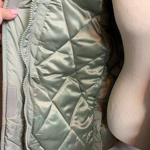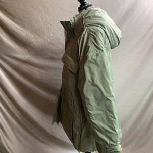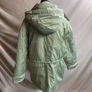 Our new easy-to-layer parka in a luxe satin nylon fabric with wind- and water-resistant properties. Features covered zip- and Velcro front, cozy interior lining, hood, Velco chest pockets, velcro side pockets, side zippers flattering interior cinched cord and recycled fill to protect against the elements.