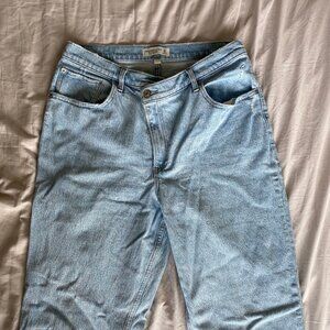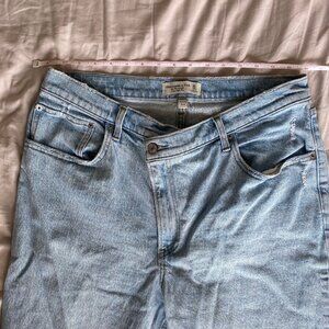 Abercrombie Curve Love Ultra High Rise 90s Straight Jean, size 32/14, Regular length. These are in the light wash with criss-cross waist. They are in really good condition, worn only a handful of times and free from any rips or pilling. The Curve Love fit is meant to better fit those with wider hips and smaller waist. These are really cute and flattering jeans! Waist measurement lying flat: 16 inches.