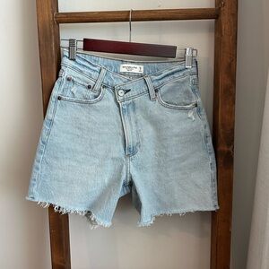 These blue jean shorts from Abercrombie & Fitch feature a high-waisted design with a distressed, cut-off hem for a trendy, raw edge. Crafted from rigid denim, they offer a vintage-inspired look with a relaxed fit, perfect for casual outings.