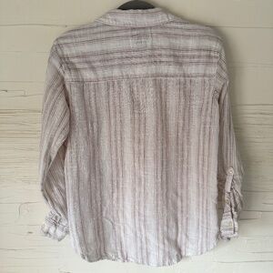 ▫️ Details: Subtle textured stripe pattern, button front, roll-tab sleeves, and curved hem
