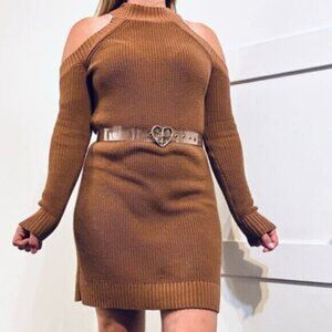 This Cold shoulder/Cut Out shoulder sweater dress is mostly natural cotton at 70%, 30% nylon, which makes this garment sensitive, eco friendly & a quality piece.