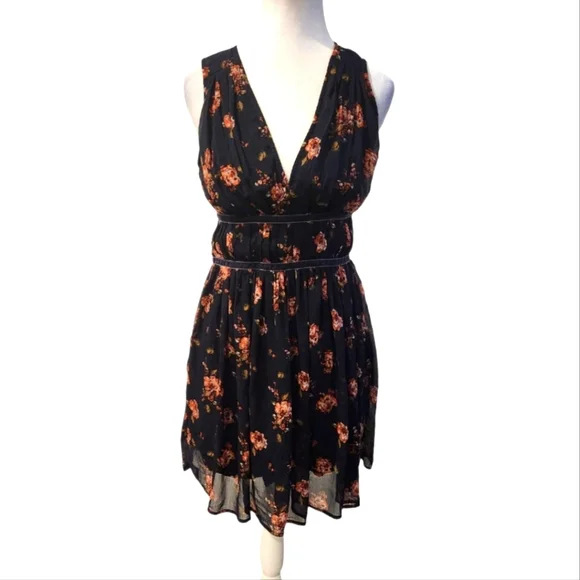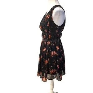 Floral Rose Print Chiffon Lined Sleeveless Dress with Velvet Trim Gathering at waist. Navy Blue and Pink.