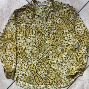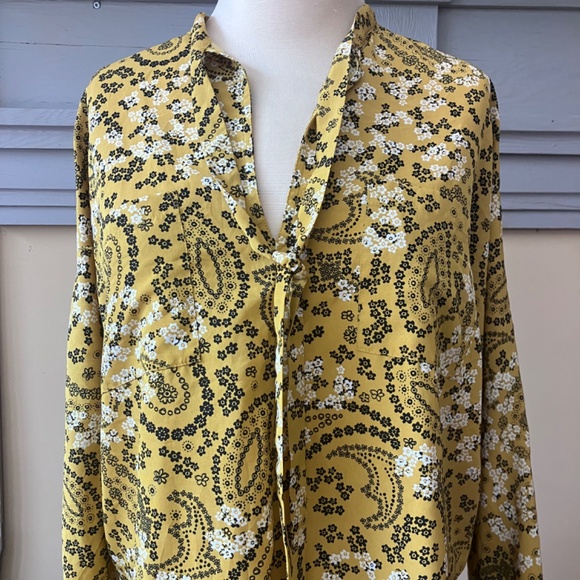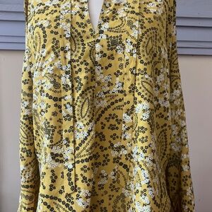 Beautiful Abercrombie & Fitch women’s blouse in a yellow, black, and white delicate floral print. Features a v-neckline with tie detail, adjustable sleeves, and two breast pockets. Lightweight and flowy, perfect for layering. Easy to dress up with trousers or a skirt for the office, or pair with jeans for a chic casual look.