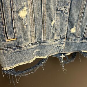 Abercrombie & Fitch S oversized trucker distressed denim jacket with a rugged look. Features frayed edges- super fun and in excellent condition