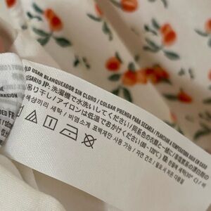 Charming peach design on an ivory background, this top features a flattering V-neck and peplum hem. From Ambercrombie, size small. In good pre-owned condition, laundered and ready to wear.