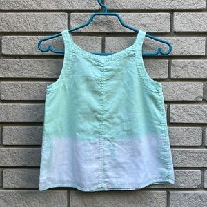100% cotton tank top. Fully lined with cute cutout detail at shoulders. Loose fitting through body, kind of an a-frame shape. Teal green at top the transitions via the dye pattern to white at bottom. In great condition. Nothing to note.
