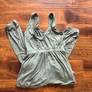 Olive green romper, super soft. Size xs. Has tie for waist as well. One stain on leg very small(see picture)