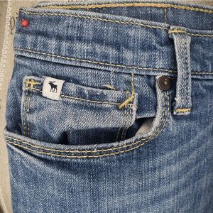 Light blue wash, lightly distressed, straight leg, "Maddy" stretch denim, low rise, straight leg jeans, by Abercrombie, New York.