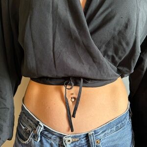 This Abercromie & Fitch cropped long sleeve blouse has elastic in the cuffs to create a flowy arm. There are two long strings in the front that can be tied many ways for a variety of different styles. Size XL. Fits like an 8/10US.