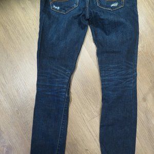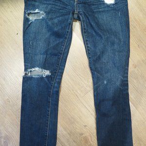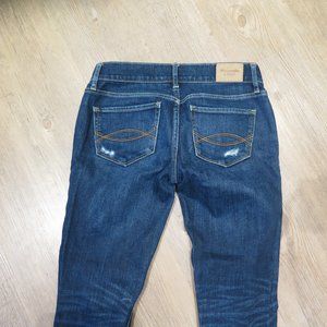 A really pretty pair of skinny jeans from Aberrombie and Fitch. Medium acid wash, super stretch, and very comfortable. Rolled cuff on the bottom and distressed elements all over (back pockets, front pockets, bottom cuffs and all the way down the front) Inspect photos carefully. Excellent used condition with no visible damage.