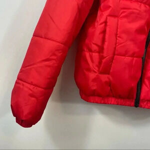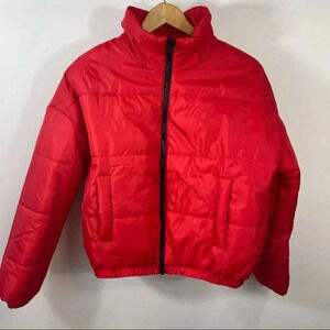 In excellent condition, a classic puffer in red. High collar, front zip closure. Elasticised waist and cuffs. Quilted construction with front slat pockets. 100% polyester.
