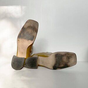 These beautiful About Arianne Nico Soller leather boots in green are worn but in good condition. Comfortable block heel and square toe in patent green/mustard leather —comes with the original box, bought from the Everything Ease store on Dundas. See photos for details.