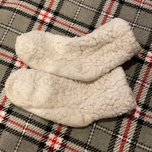 Pre-loved and pre-worn by my kiddo a handful of times around the house because he doesn’t like slippers but I needed him to have grip on our floors. Super cozy. Washed and hang dried ready for the next little one. Buyer please note I took the time to make sure these were clean for the next little one but there is some little specks in the Sherpa cuff I couldn’t get out. Doesn’t inhibit the socks but wanted to disclose. See pic #7