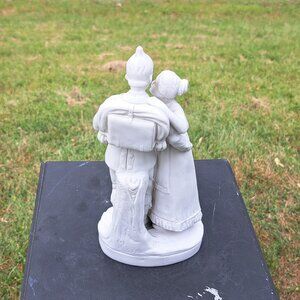 An old bisque porcelain statue titled "Abschied," German for "Farewell." It depicts a German soldier wearing his kit being hugged by his wife before being deployed. It was probably made in WW1 or just after it; the uniform of the soldier was in use between 1907 and about 1916. There are no chips and the couple's eyes and mouths are accented in gold. There is maker's mark on the rear but I cannot find a match. It is 8 3/4" in height, 4 1/4" in width and just under 3" in depth.