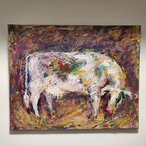 Enhance your space with this vibrant abstract cow painting. Featuring a blend of colors, this artwork adds a dynamic touch to any room.